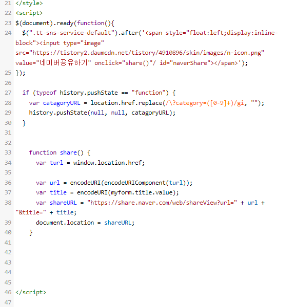 소스코드 설명을 드리면 24번 라인은 공유하기 버튼을 임의적으로 넣은 부분이구요,