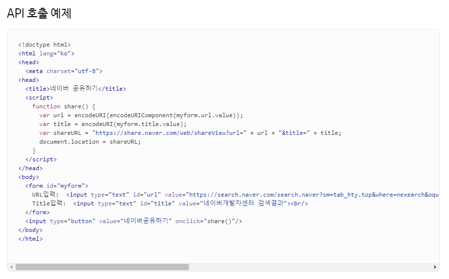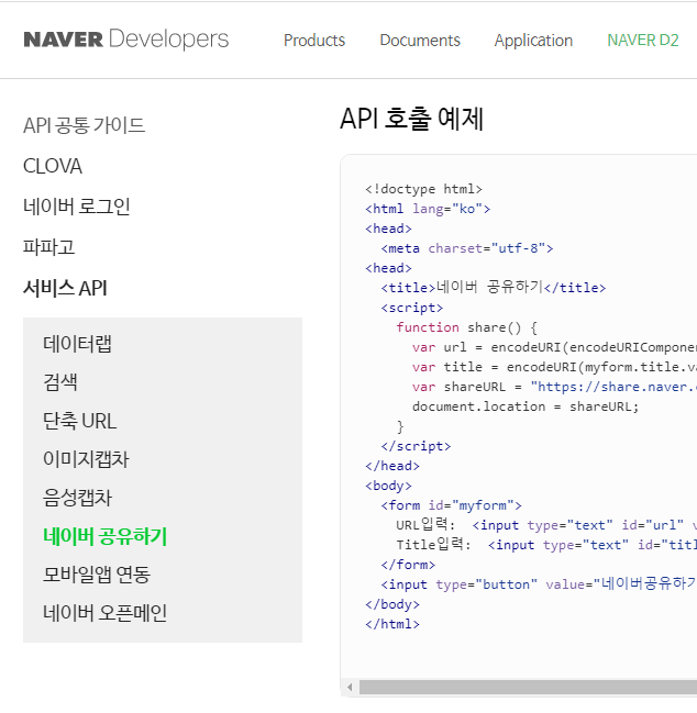 네이버 공유하기는 네이버에서 제공하는 API 호출 예제를 이용해서 작업했는데요,