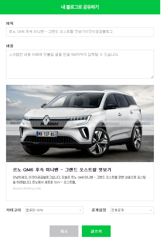 위에 있는 네이버 공유하기 버튼을 누르면 아래와 같이 내블로그로 공유하기 화면이 나오게 되구요,